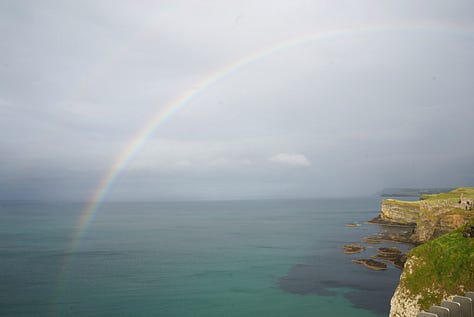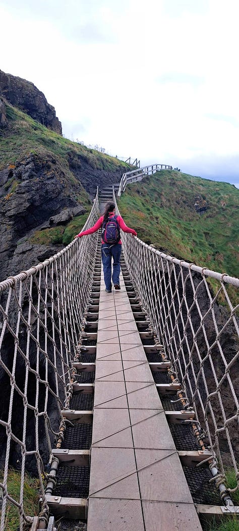 – a weekend of long, meandering heart-to-heart conversations, of swimming in the very sea that rocked the Children of Lir for 300 years, walking on the Carrick-a-Rede rope bridge over the mighty Atlantic breakers and between ancient volcanic outcrops, and seeing a complete rainbow over the Causeway Coast to close out our trip. And it felt like a clearing out to start anew, from my centre; it felt like setting the stage for the stories I want to tell.Which is to say, I began remembering why I started.